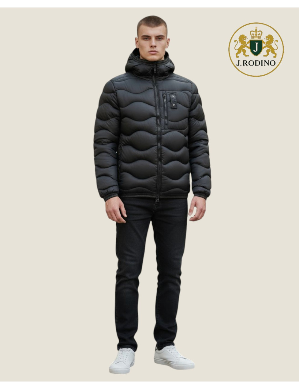 Giubbotto imbottito J.RODINO in 100% nylon, modello urban con cappuccio regolabile. Leggero ma caldo, ideale per la stagione fredda. Colore Nero con finitura lucida.