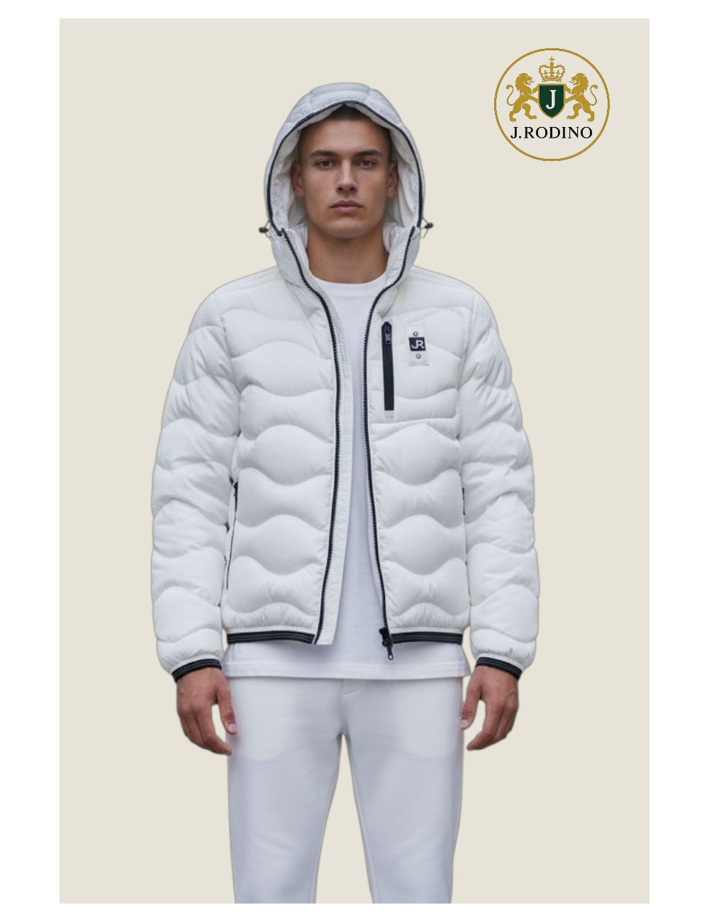 Giubbotto imbottito J.RODINO in 100% nylon, modello urban con cappuccio regolabile. Leggero ma caldo, ideale per la stagione fredda. Colore Bianco con finitura lucida.