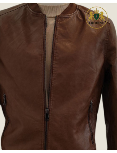 Giubbino uomo modello VITO Eco Bomber in morbida ecopelle color cuoio. Linea pulita con zip frontale, collo e polsi in maglia elastica, tasche laterali con chiusura a zip. Un classico intramontabile reinterpretato in chiave contemporanea con la cura sartoriale J.RODINO.
