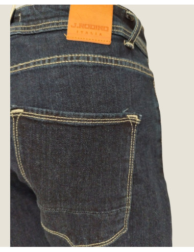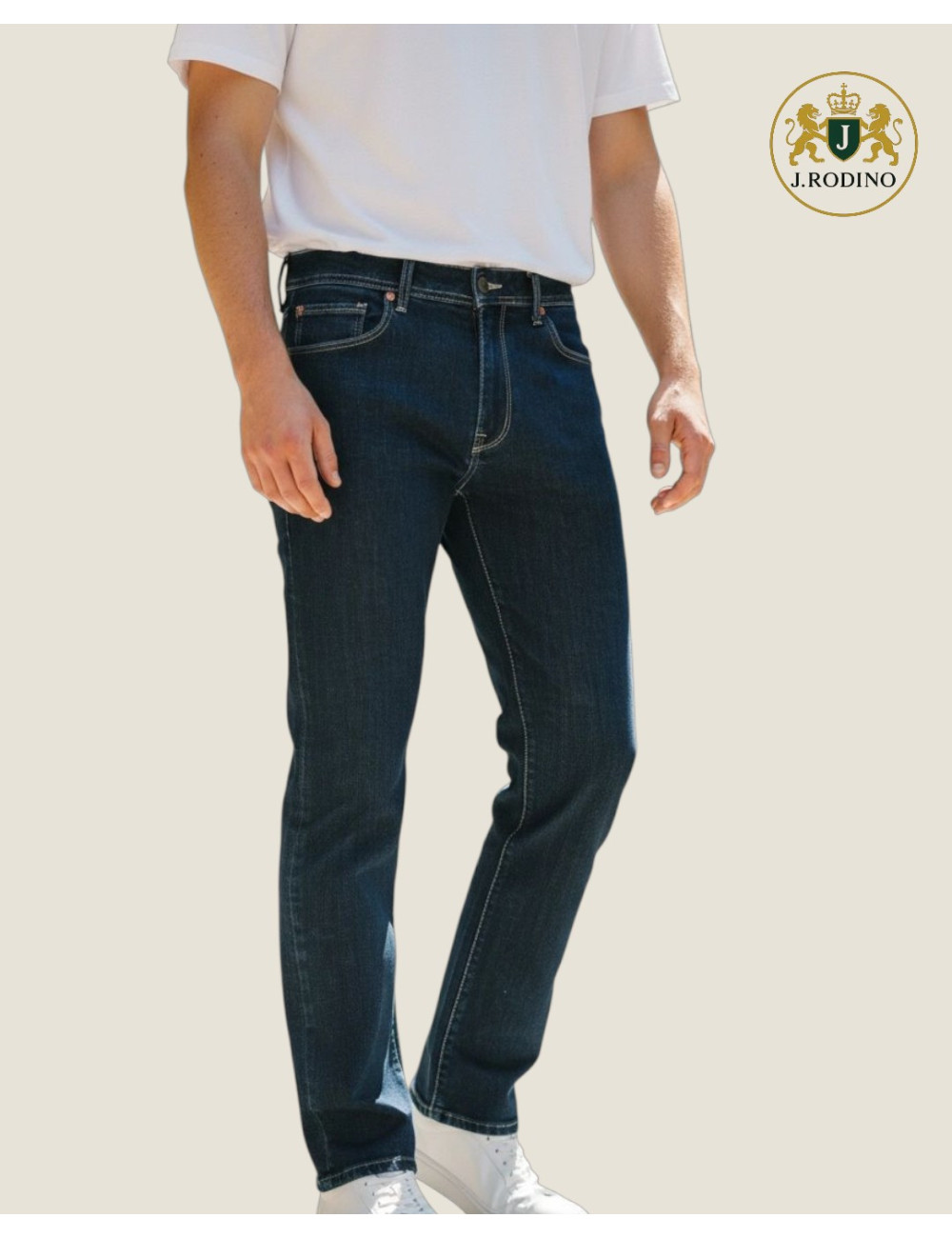 Jeans slim J.RODINO in denim blu scuro con lavaggio sobrio e dettagli puliti. Realizzato in tessuto elasticizzato (98% cotone, 2% elastan) per una vestibilità aderente e confortevole. Stile essenziale, perfetto per ogni occasione.